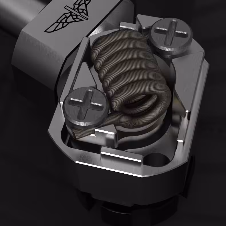 The resistance sits low in comparison with the channels, allowing the wick to be fed more quickly and effectively. The deck has 2 screws that hold the wire in place.